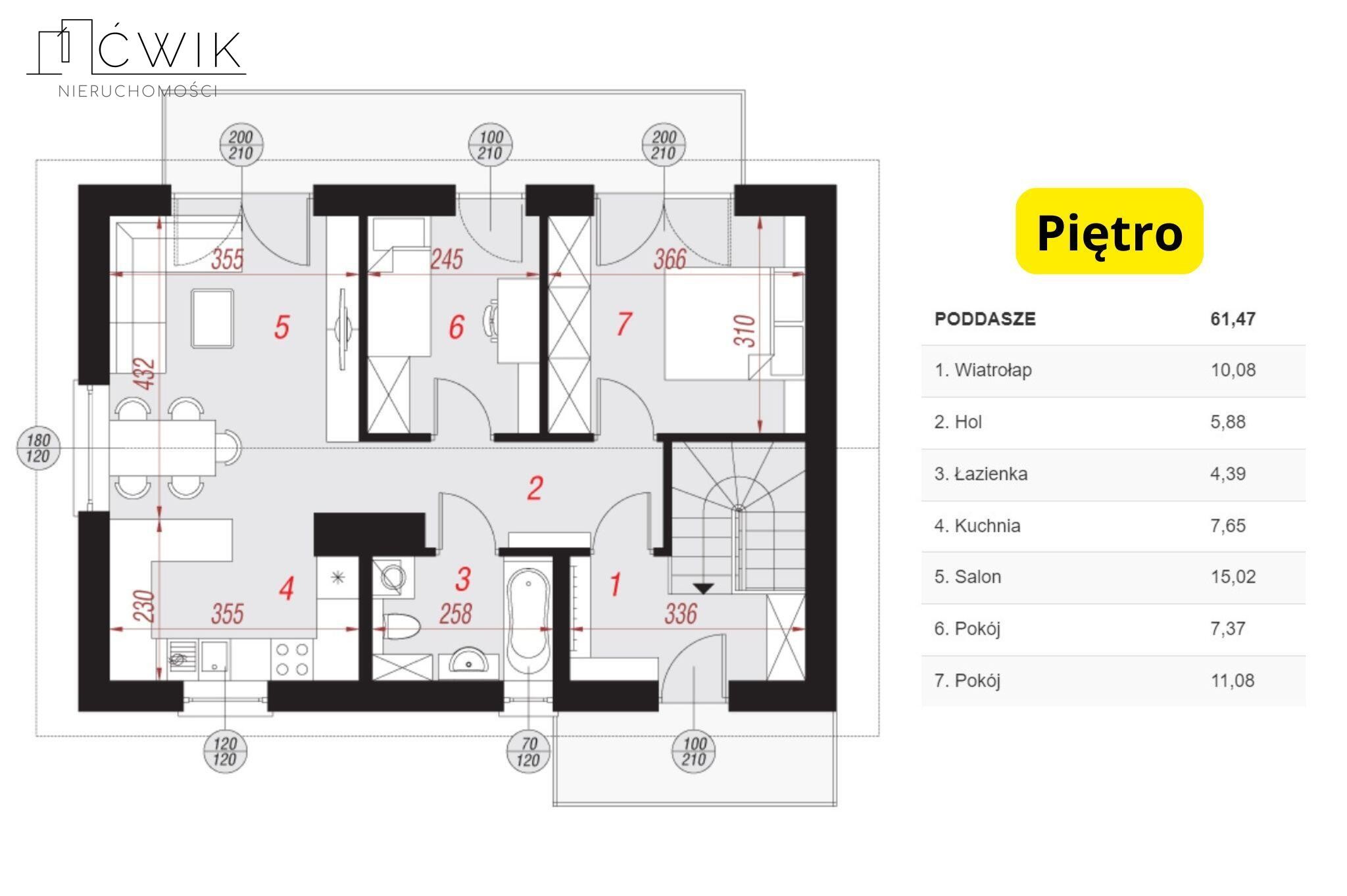 - Piętro - 61,47 m2 z balkonem, prywatnym ogródkiem oraz strychem do zagospodarowania.